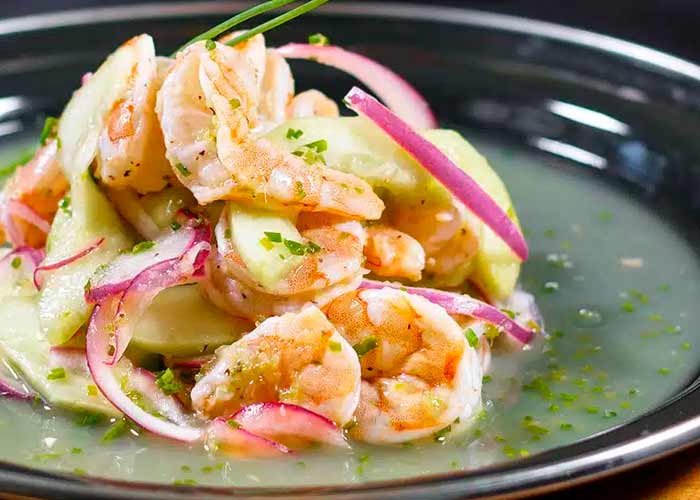 265g de camarón 2125 marinado en jugo de limón, pepino, chile habanero, cilantro, sal y pimienta acompañado de aguacate y pepino.