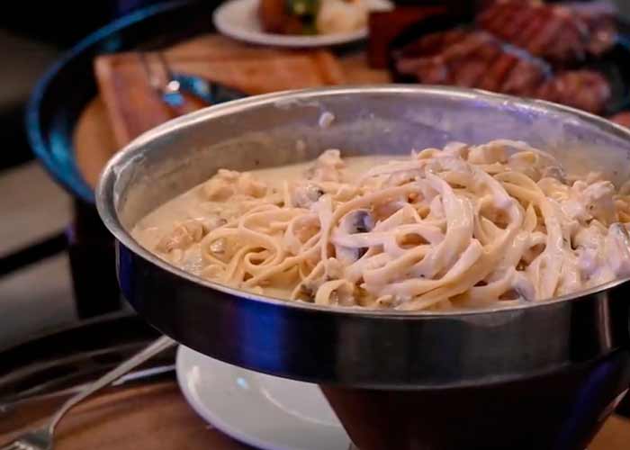 180g de pasta fetuccini, pollo, carne roja, camarón 2125, bañado en crema lyncott, vino blanco y queso parmesano.