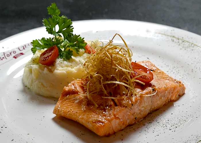 220g de salmón, jugos cítricos (ponzu), picante opcional (habanero o serrano), acompañado de un jardín de cebolla y cebollín.